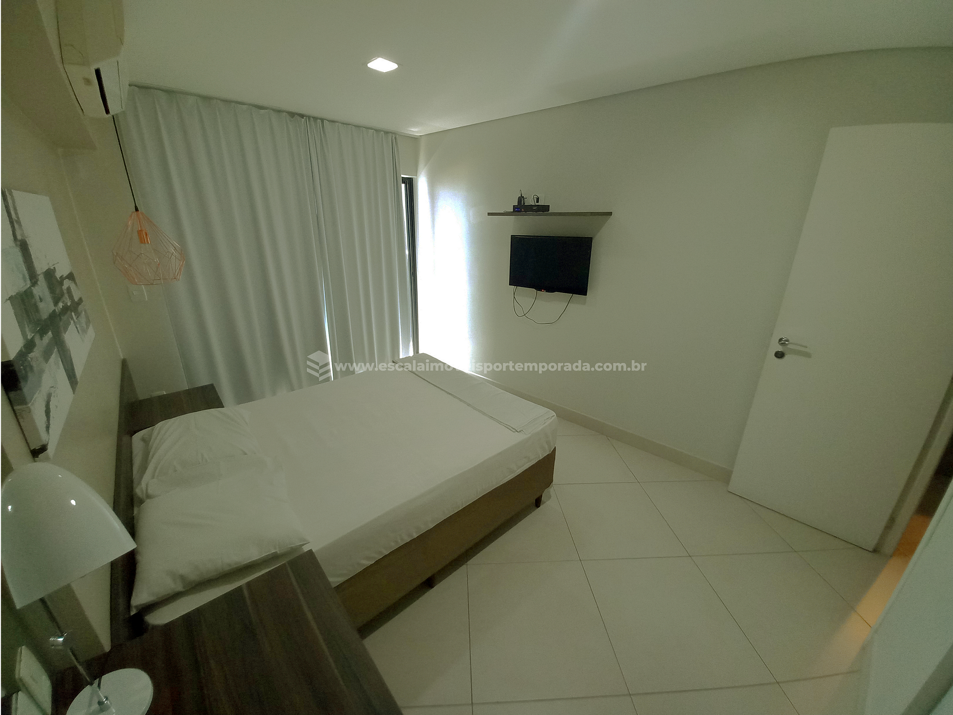 * Um quarto com cama casal, ar condicionado, tv, armários.