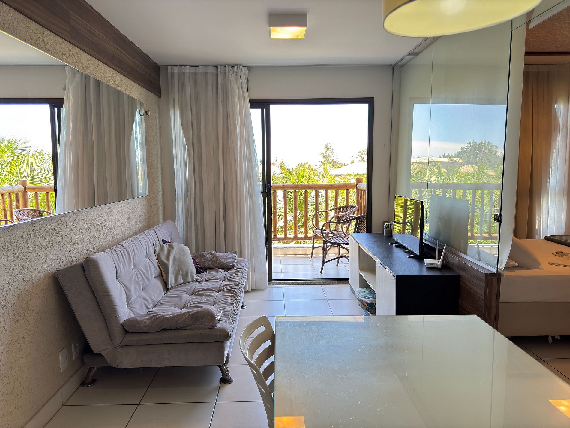 O condomínio é maravilhoso, muitas comodidades, piscina bem grande, academia, quadra de tênis e a o acesso à praia é muito bom. O apartamento que fiquei tem uma linda vista do mar, bem ventilado, com tudo, panelas, pratos, talheres.