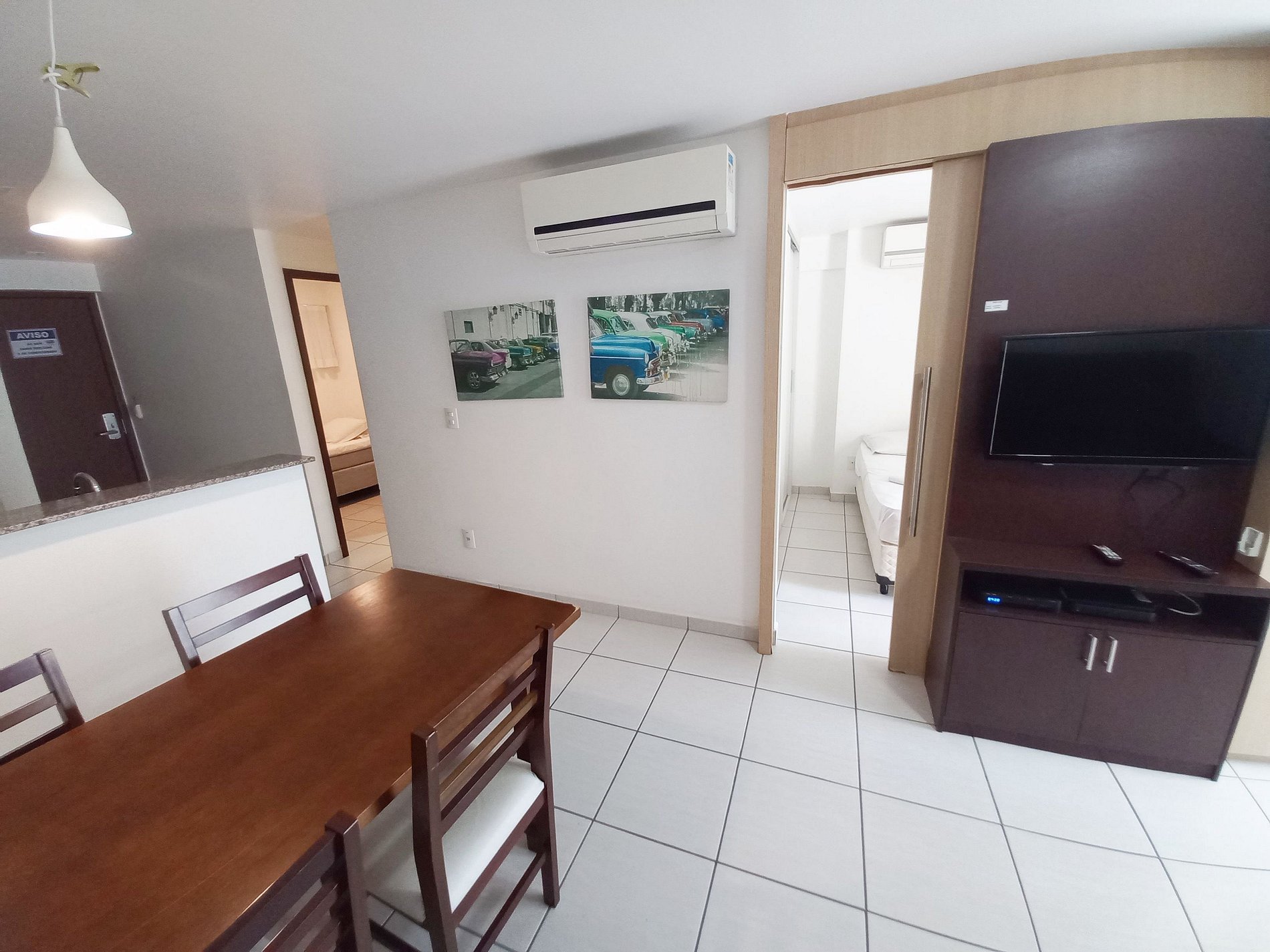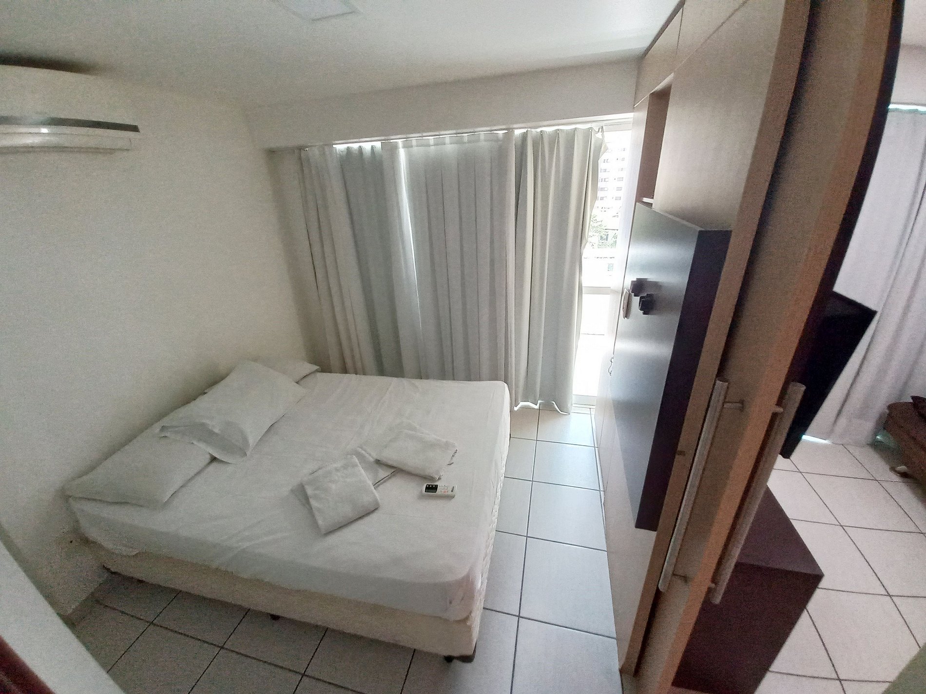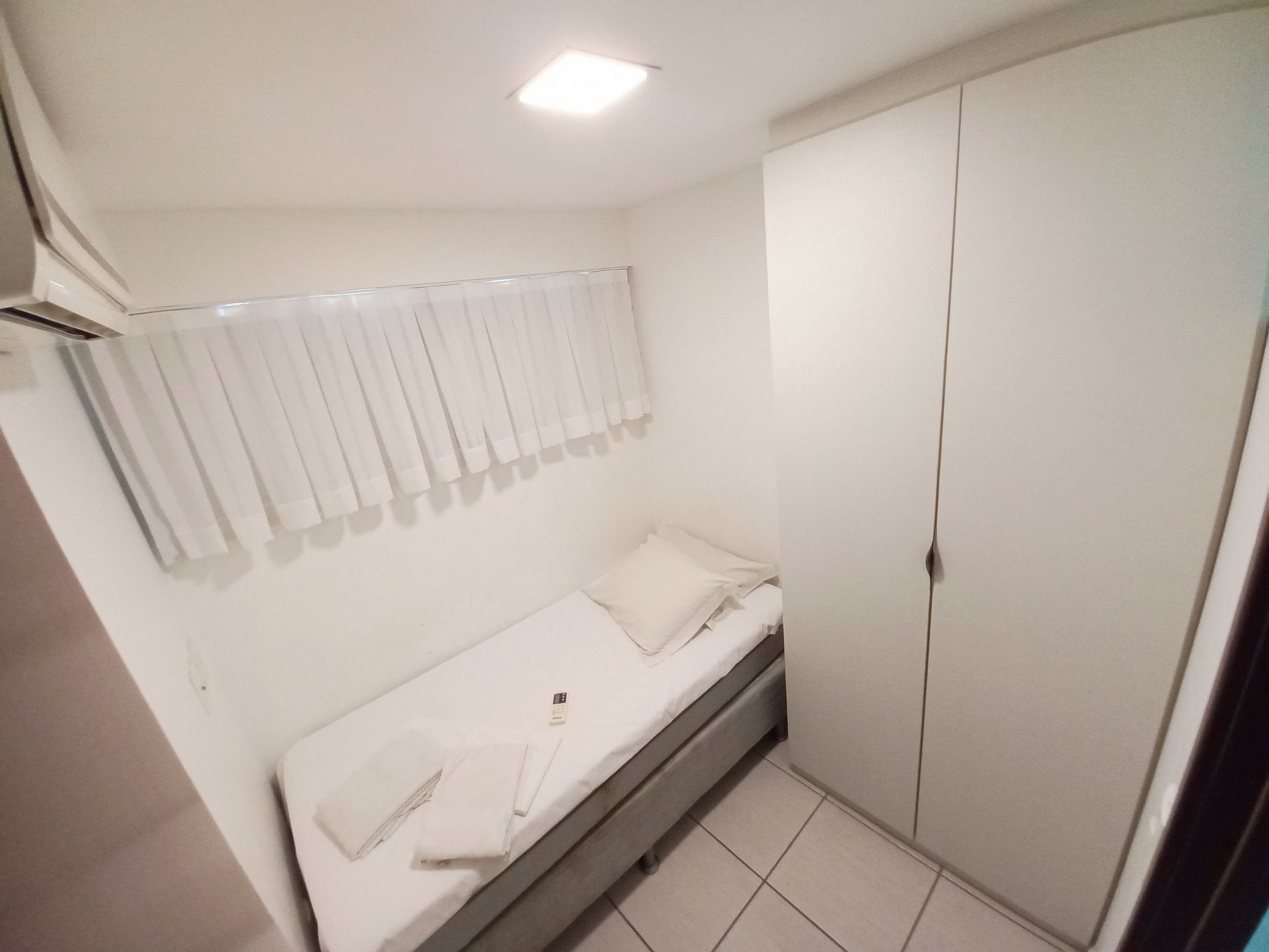 Apartamento 100% mobiliado, 2 quartos com ar condicionado, sendo 1 suíte com cama casal.