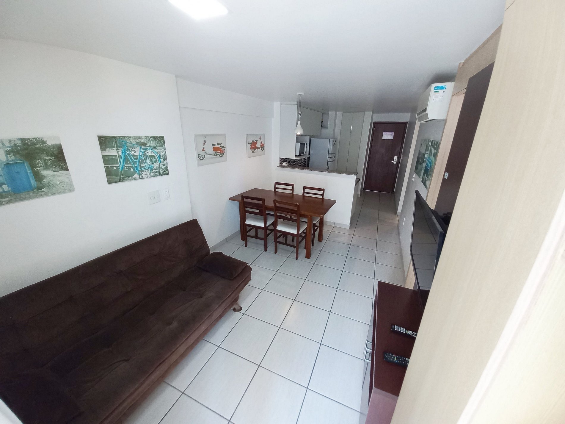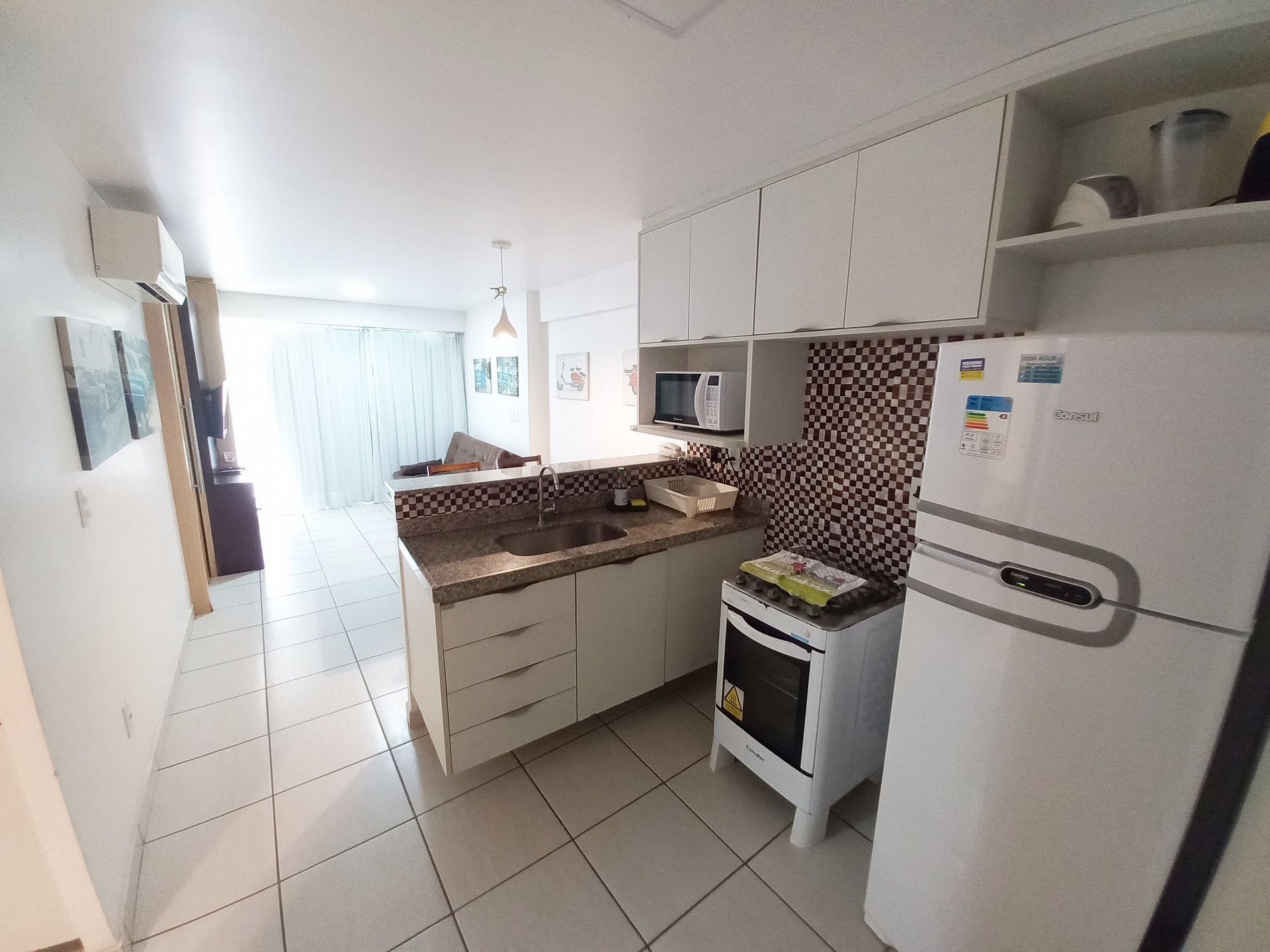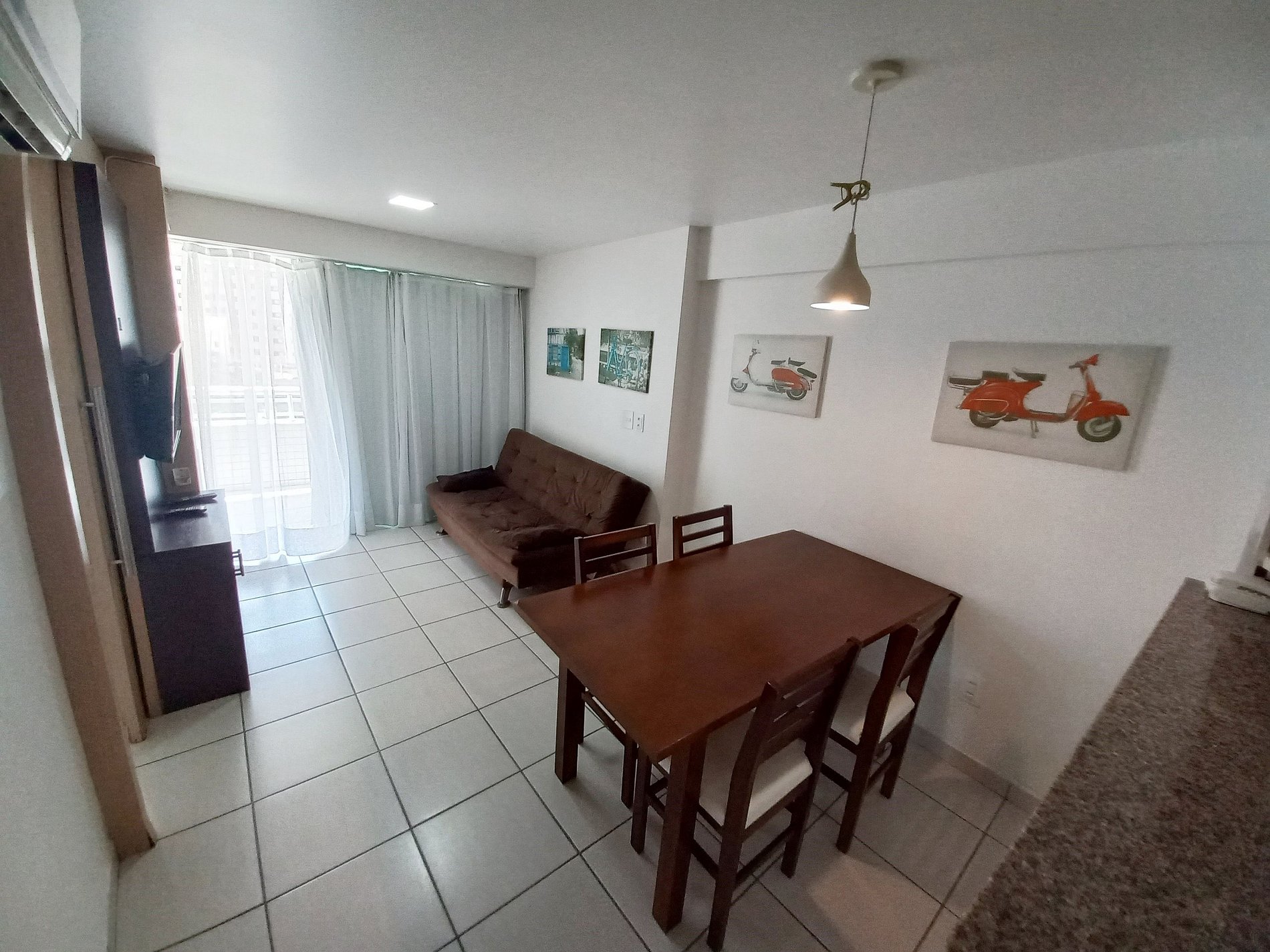 Apartamento 100% mobiliado, 2 quartos com ar condicionado, sendo 1 suíte com cama casal.