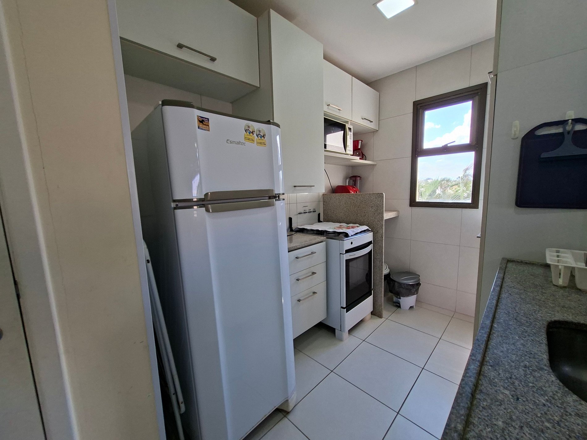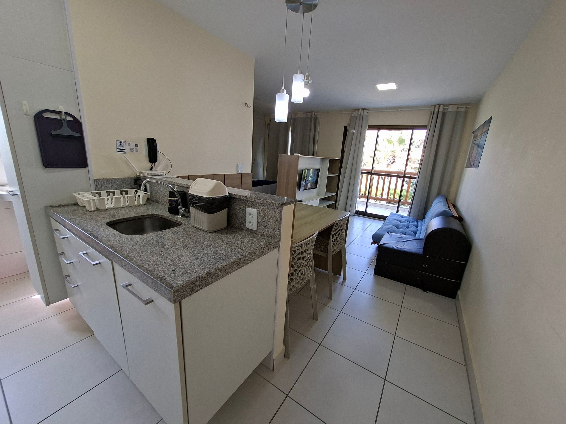 Enjoy a charming and cozy suite, perfect for your nights of rest. The living room, integrated with the American kitchen, offers a spacious and inviting area for moments of gathering. For your entertainment, the apartment has a TV, and in the kitchen, all the necessary household utensils for your stay.
