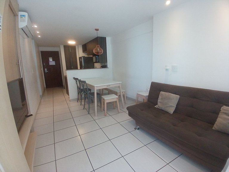 Enjoy the most vibrant location in Fortaleza in this beautiful apartment, situated within the renowned Beach Class Fortaleza condominium, just meters from the famous Iracema Beach. Staying here means having the convenience of being next to the boardwalk, the best restaurants, bars, and taxi stands, right in the heart of the city's nightlife and tourist scene.