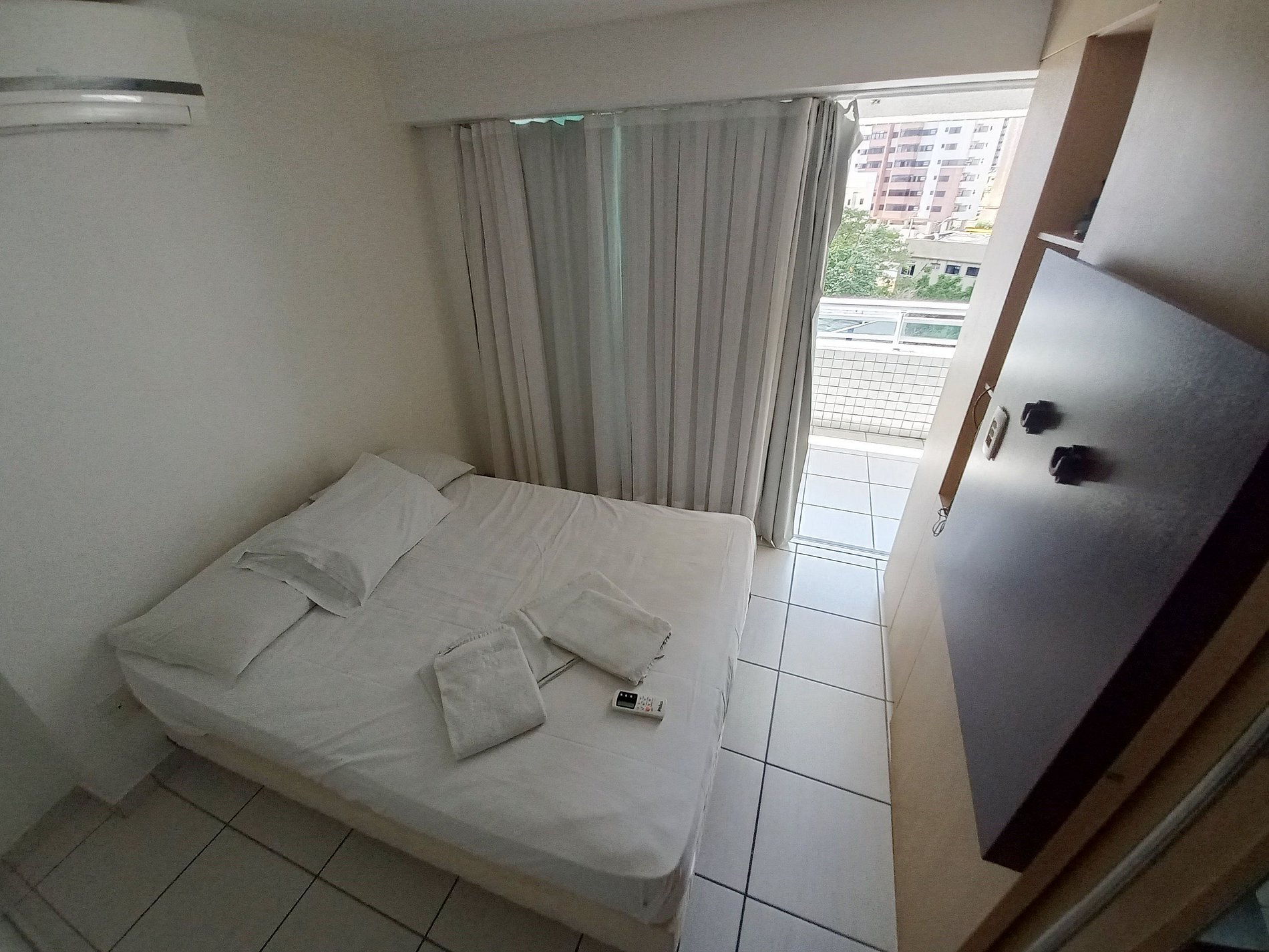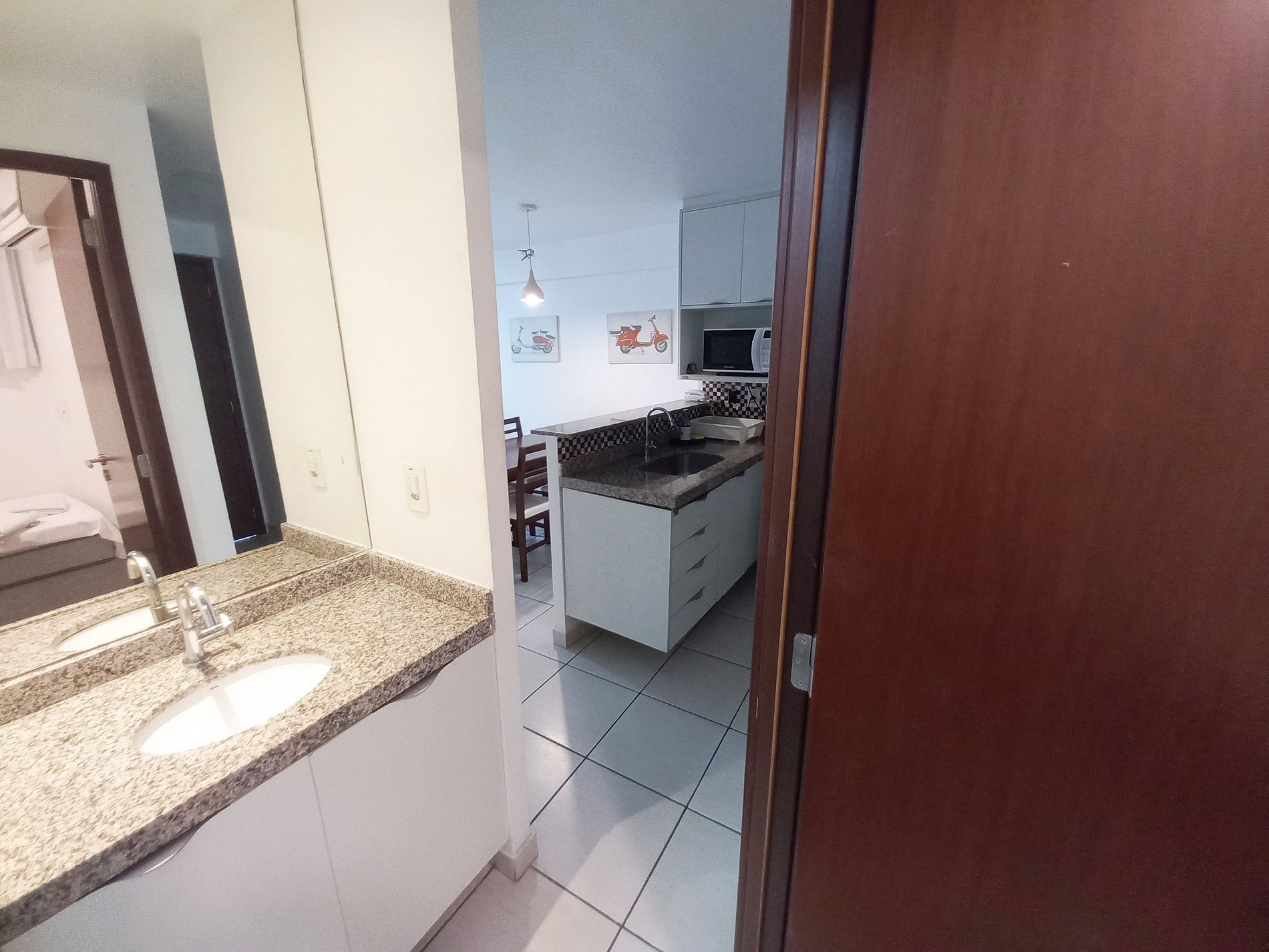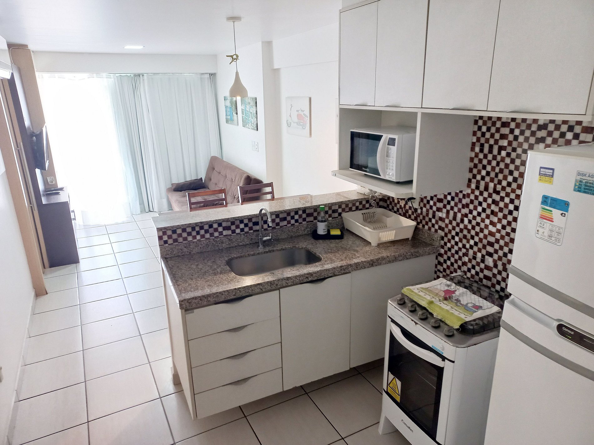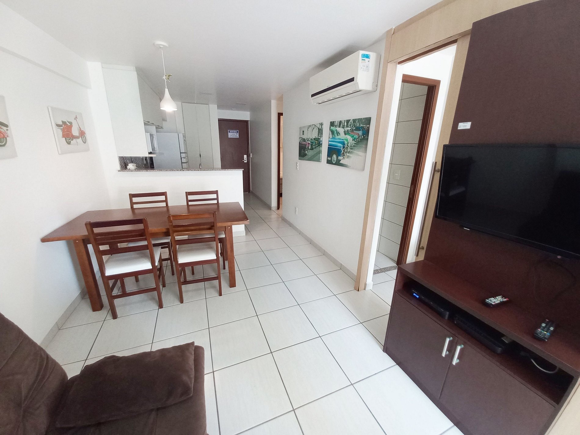 Apartamento 100% mobiliado, 2 quartos com ar condicionado, sendo 1 suíte com cama casal.