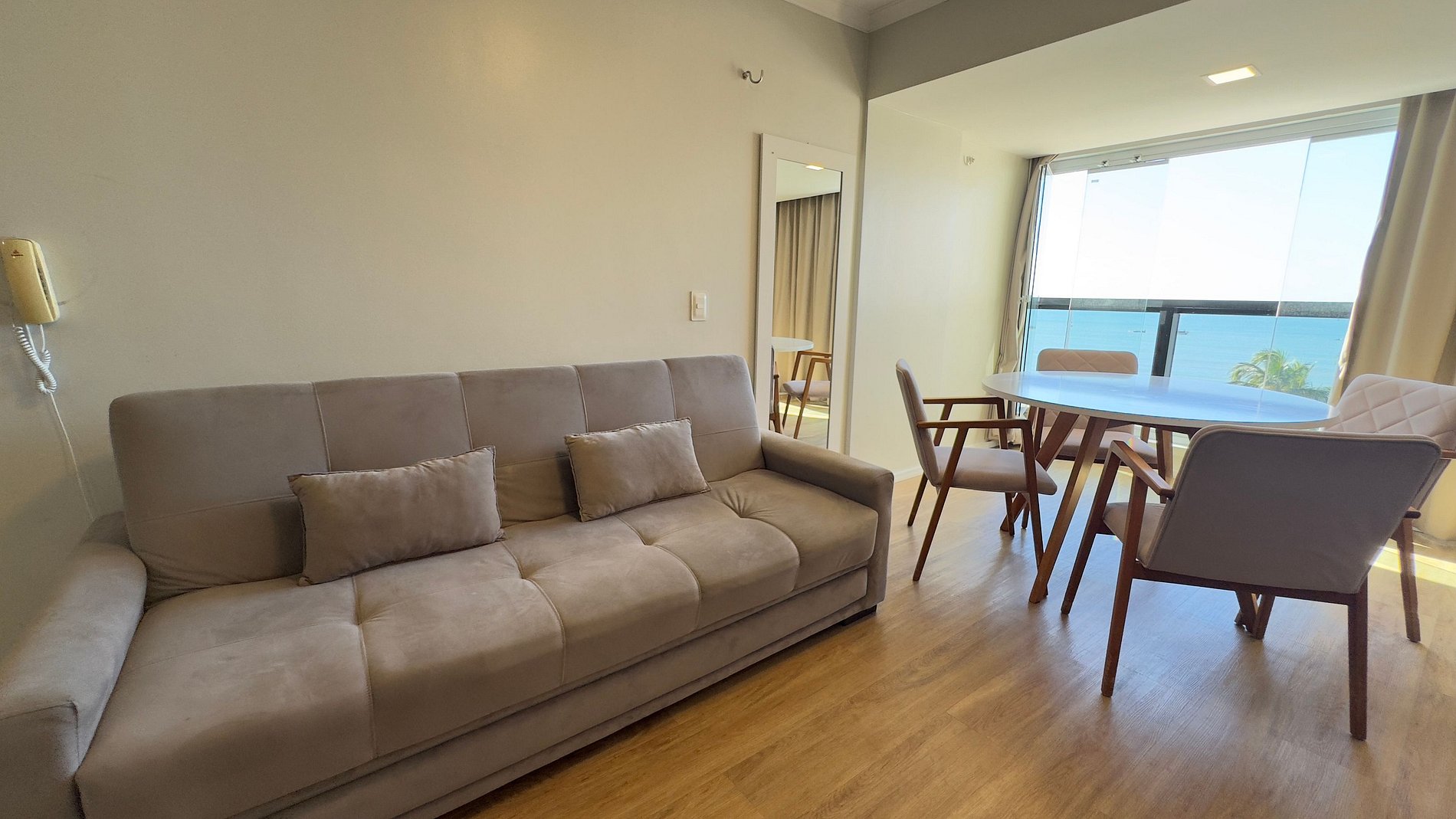 Nuestro flat en Iracema Residence se distingue por su vista privilegiada al mar y por el equilibrio entre comodidad y practicidad. Compacto pero bien diseñado, cuenta con cocina equipada, sala con sofá cama y un balcón con un paisaje inolvidable. El dormitorio acogedor con aire acondicionado asegura noches tranquilas, mientras que el Wi-Fi y el estacionamiento privado brindan mayor comodidad durante su estadía.