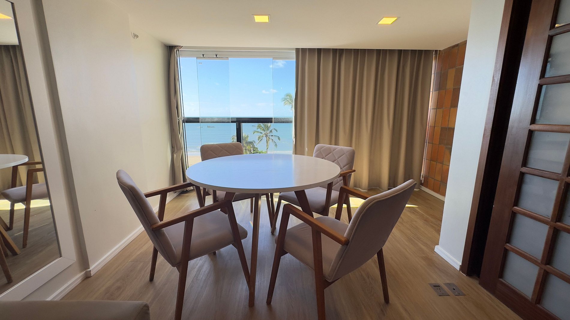 Este flat exclusivo en Iracema Residence es ideal para quienes buscan comodidad y privacidad frente al mar. Compacto pero totalmente equipado, ofrece una cocina funcional, sala acogedora con sofá cama y un balcón con vistas inolvidables al océano, perfecto para cenar con el mar como escenario. El dormitorio cuenta con cama doble, aire acondicionado y baño privado, garantizando una estadía confortable.