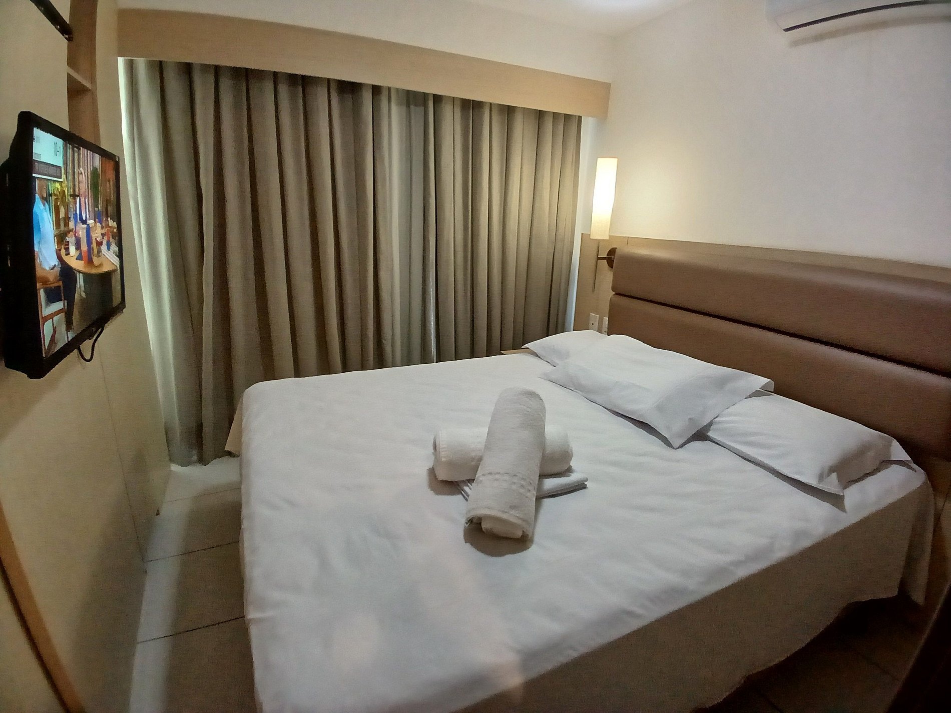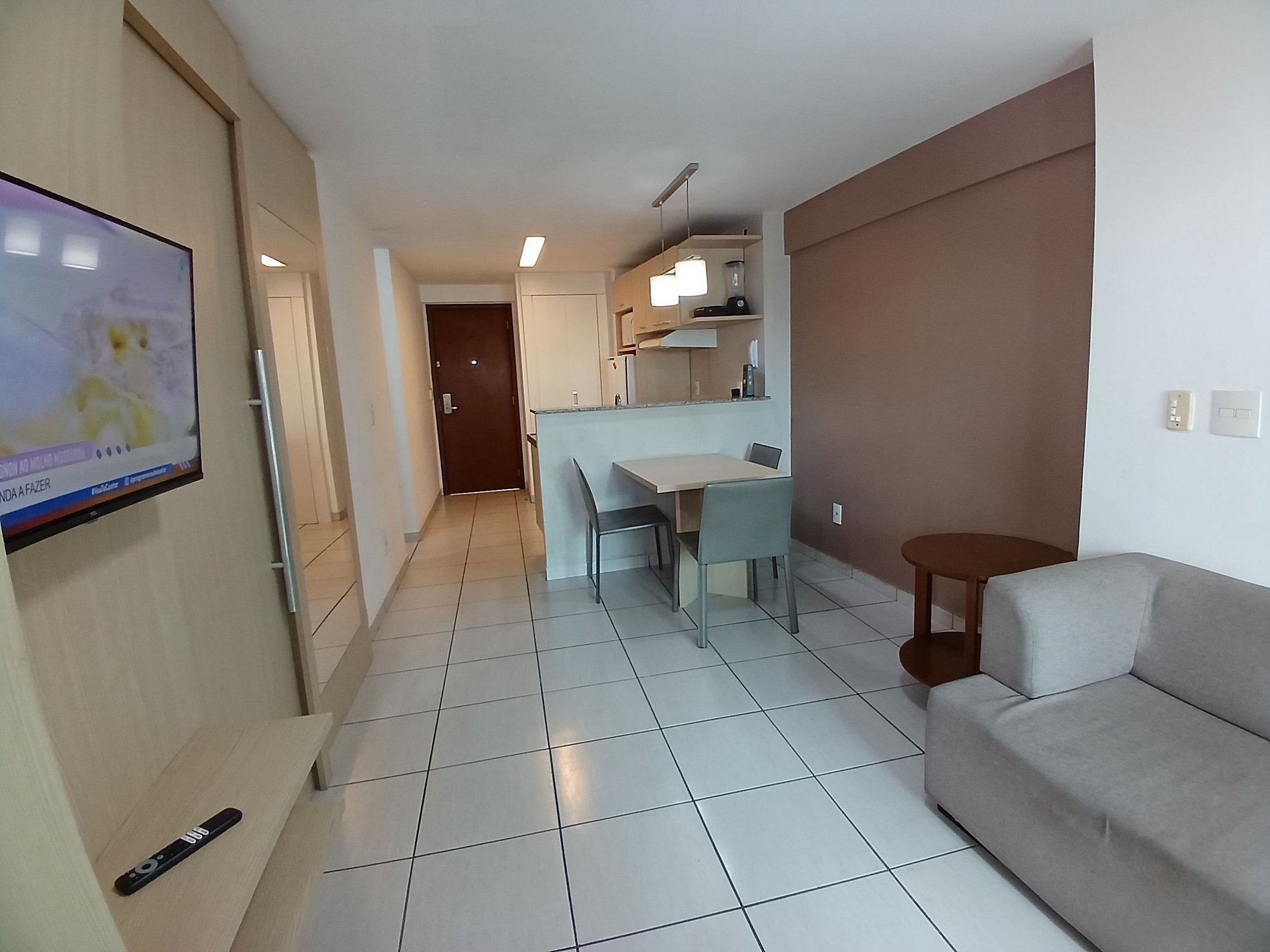 Apartamento tem 56m, sendo 1 suíte com cama casal, tv e ar condicionado; 1 quarto com cama solteiro, tv e ar condicionado; sala com tv, colchão extra, cozinha equipada para pequenas e rápidas refeições. Espaçosa varanda com tela de proteção.