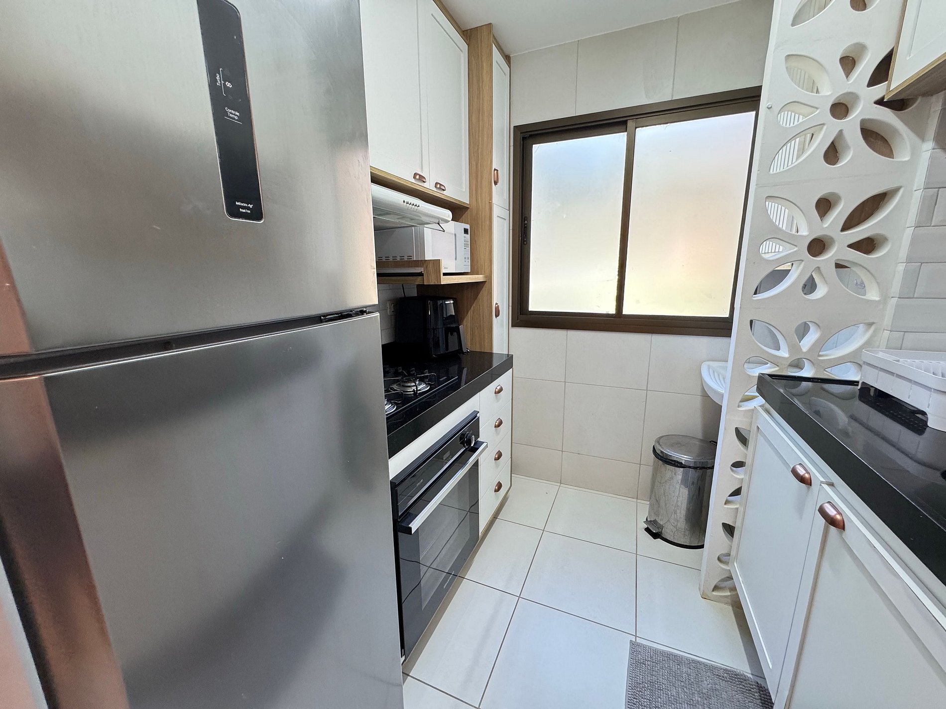 Cocina compacta y funcional: equipada con nevera, estufa, microondas, utensilios completos y práctica freidora de aire para comidas deliciosas y fáciles.