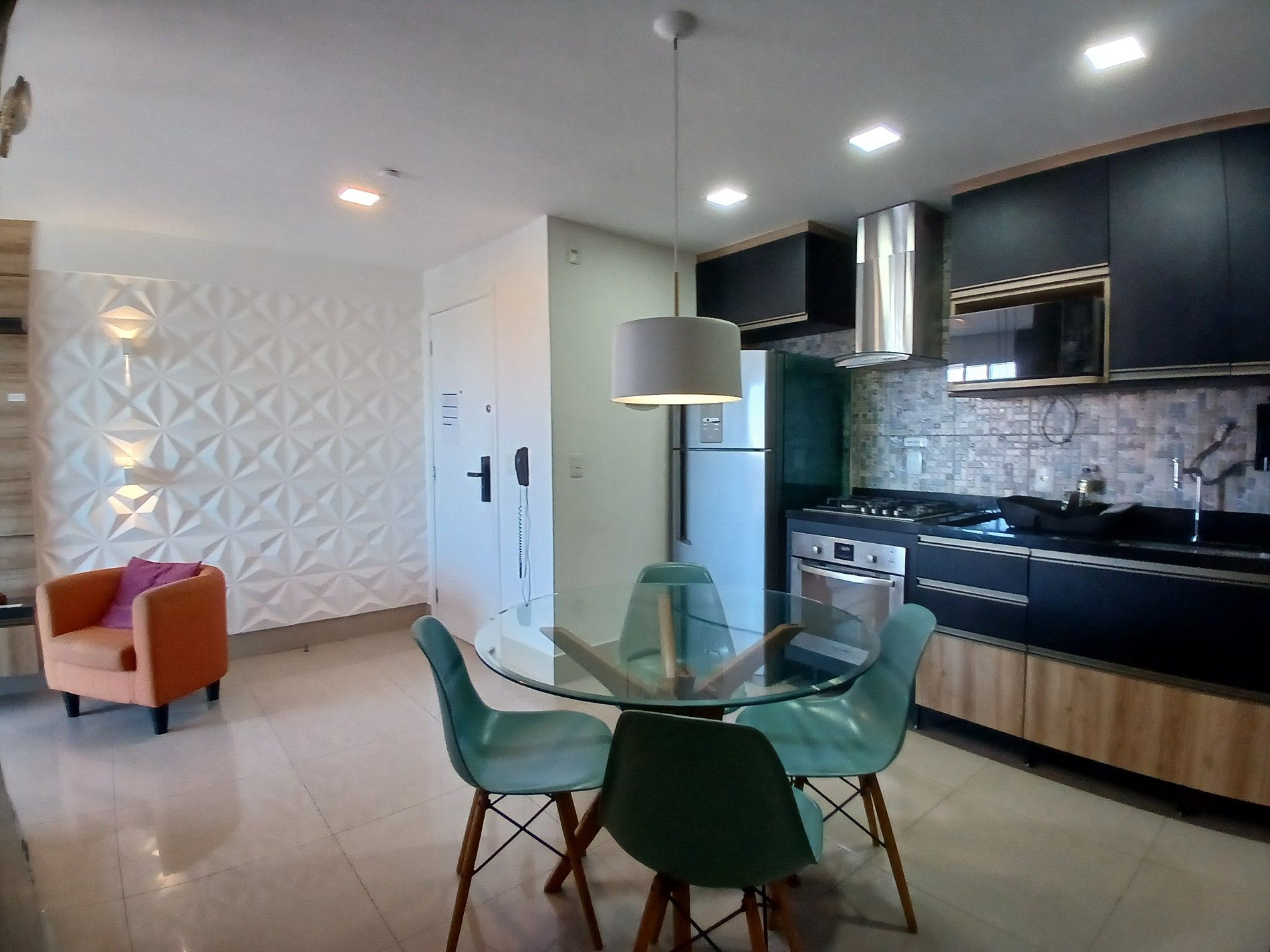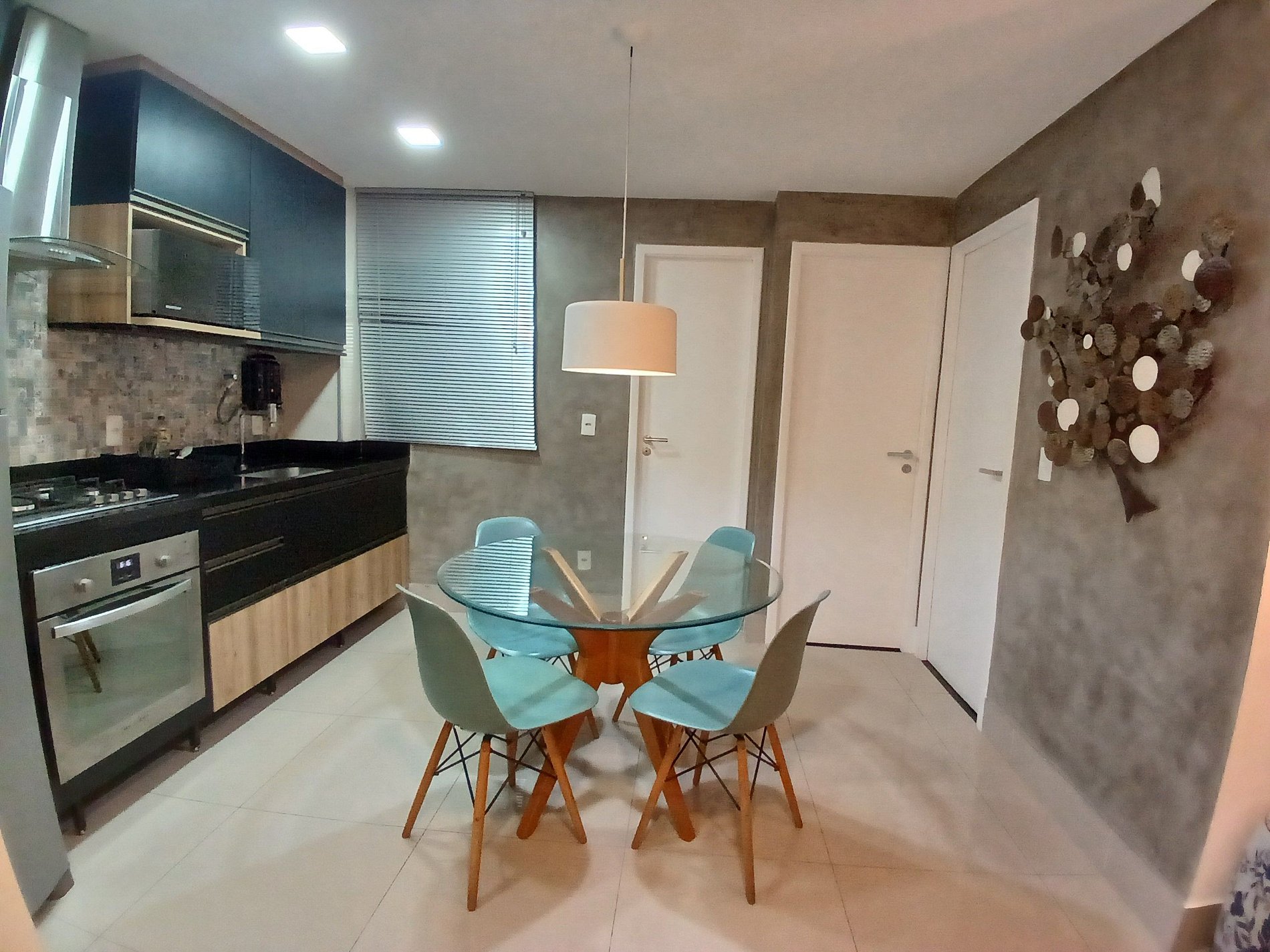 Na cozinha há forno, micro, torradeira, liquidificador e uma variedade de utensílios, os 2 quartos possuem ar condicionado e variados tipos de iluminaçao a sala também. A porta c senha também é um diferencial pois n precisa se preocupar c perder chave ou catão. A piscina é grande e limpa e possui uma raia p praticar natação. Possui tv na sala e num quarto. O predio possui 3 elevadores q facilitam bastante p n perder tempo na espera. O edificio possui lavanderia propria (paga), e uma pequena academia.