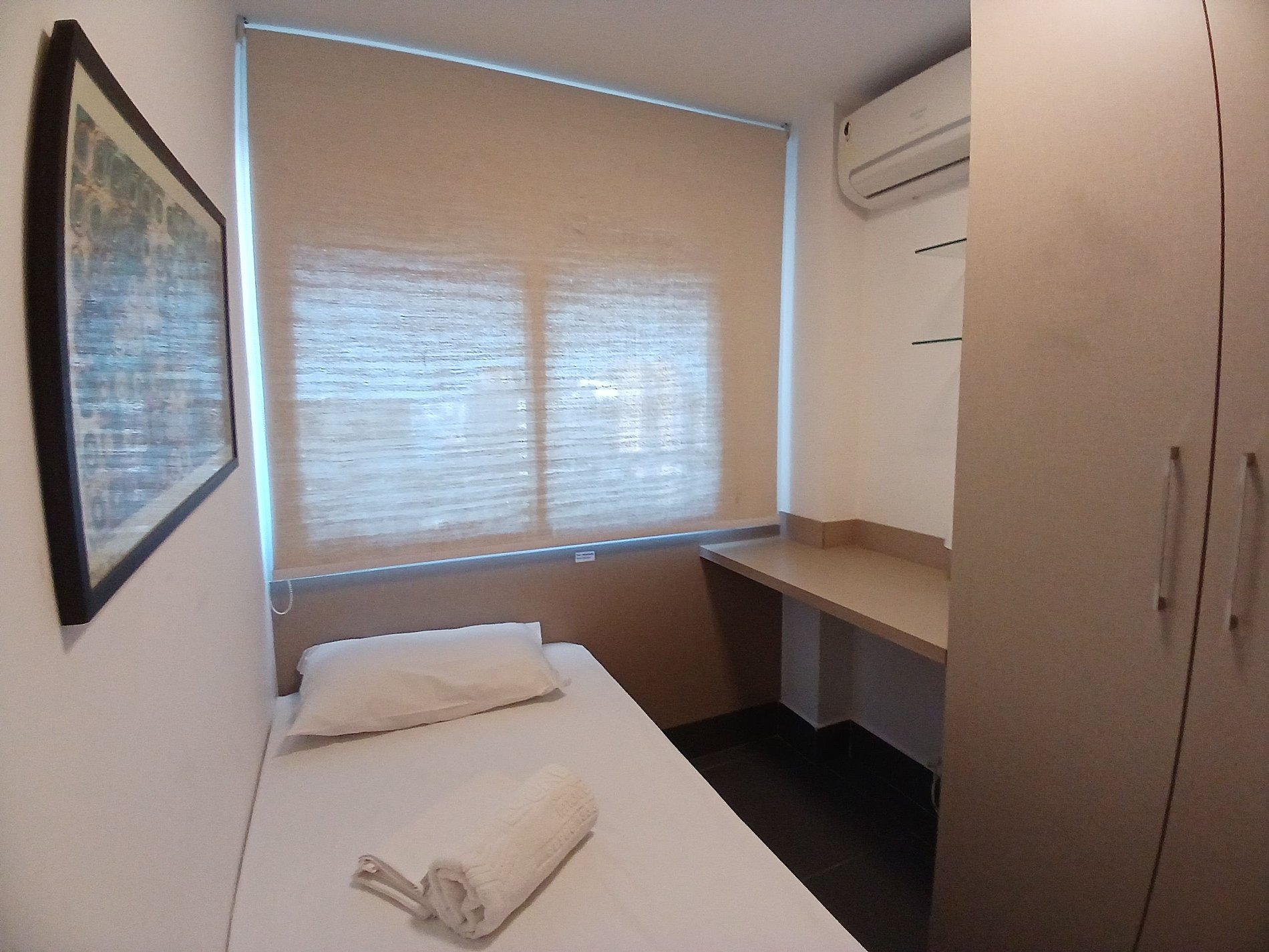 Poderiam colocar no quarto de solteiro uma manta p se cobrir e um blackout na janela pois era muito claro.