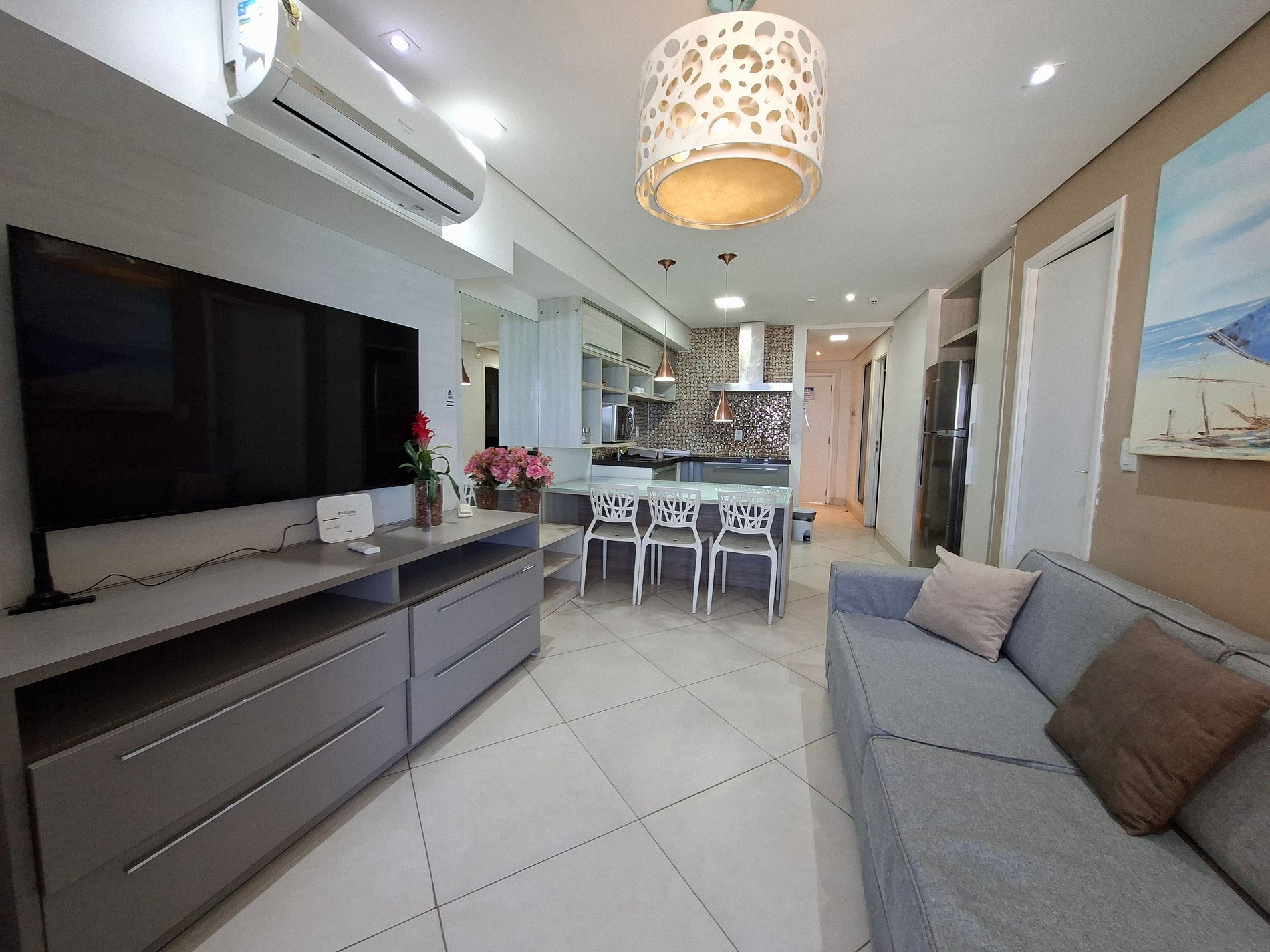 O imóvel tem 2 quartos com cama casal e ar, sendo 1 suíte. 1 banheiro social. Sala com ar condicionado. Cozinha equipada.