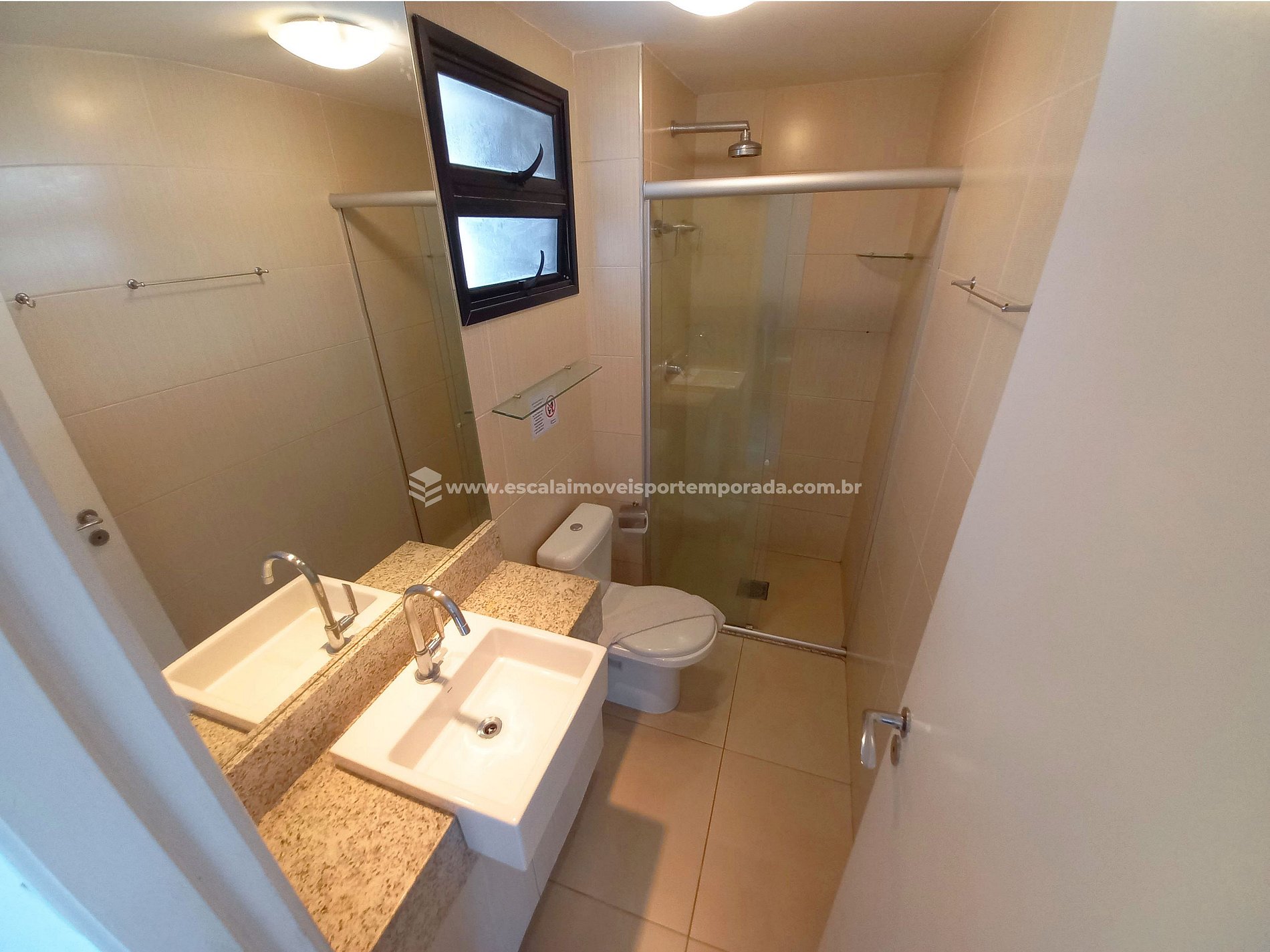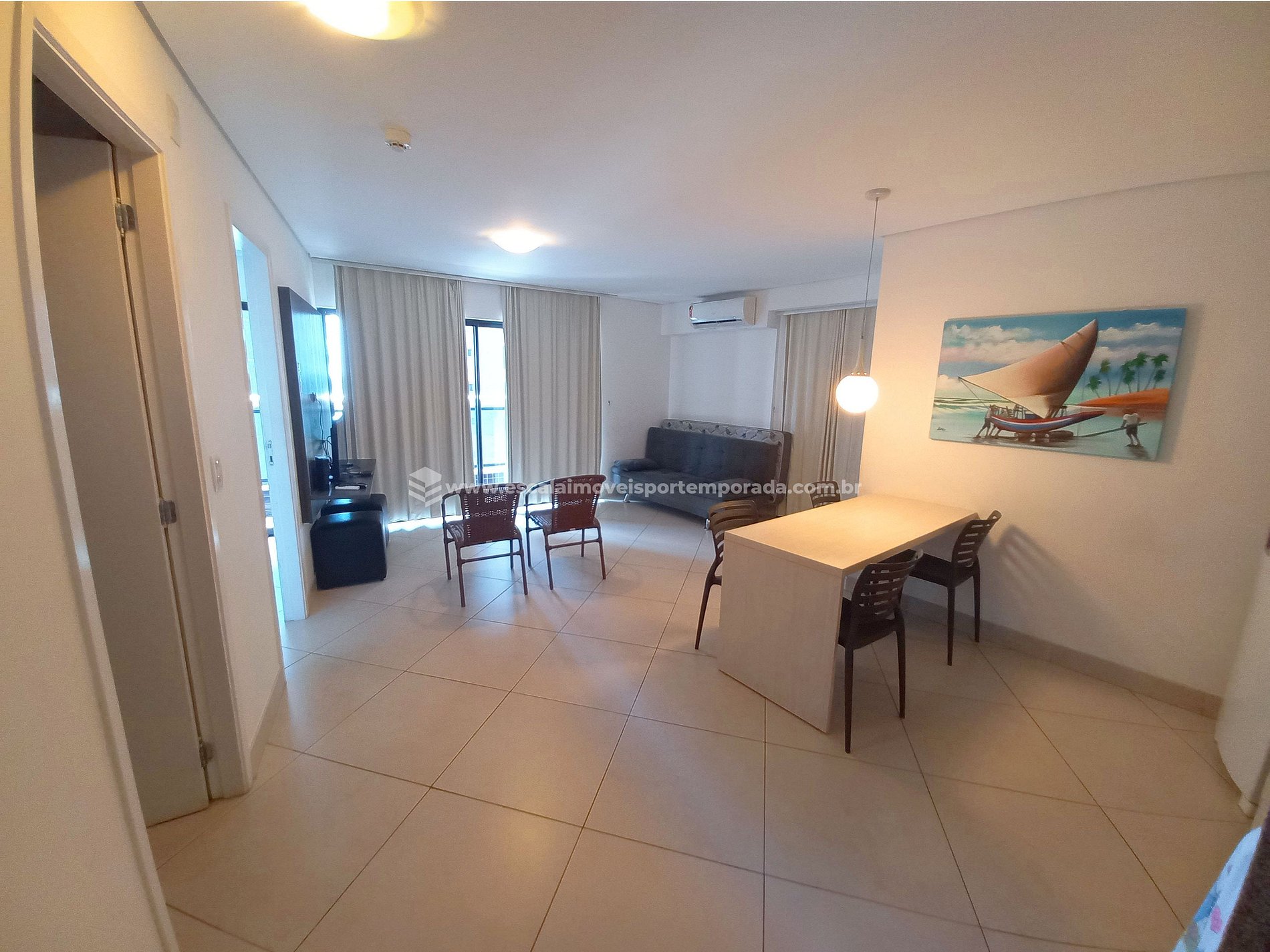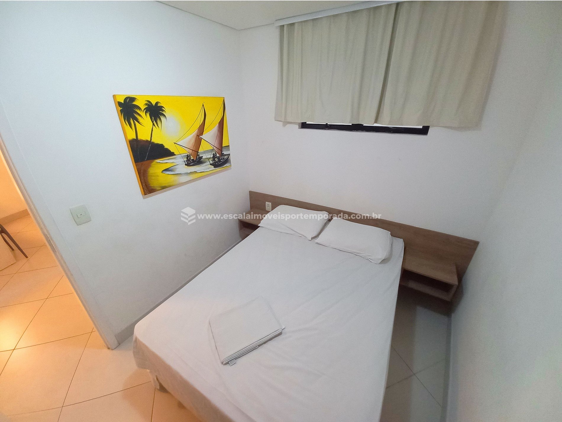 O apartamento tem uma suíte com cama casal e ar condicionado; quarto com cama casal e ar condicionado; sala com sofá cama e ar condicionado. Banheiro social. Cozinha compacta. Varanda com vista parcial mar. WiFi gratuito. 1 vaga de estacionamento.