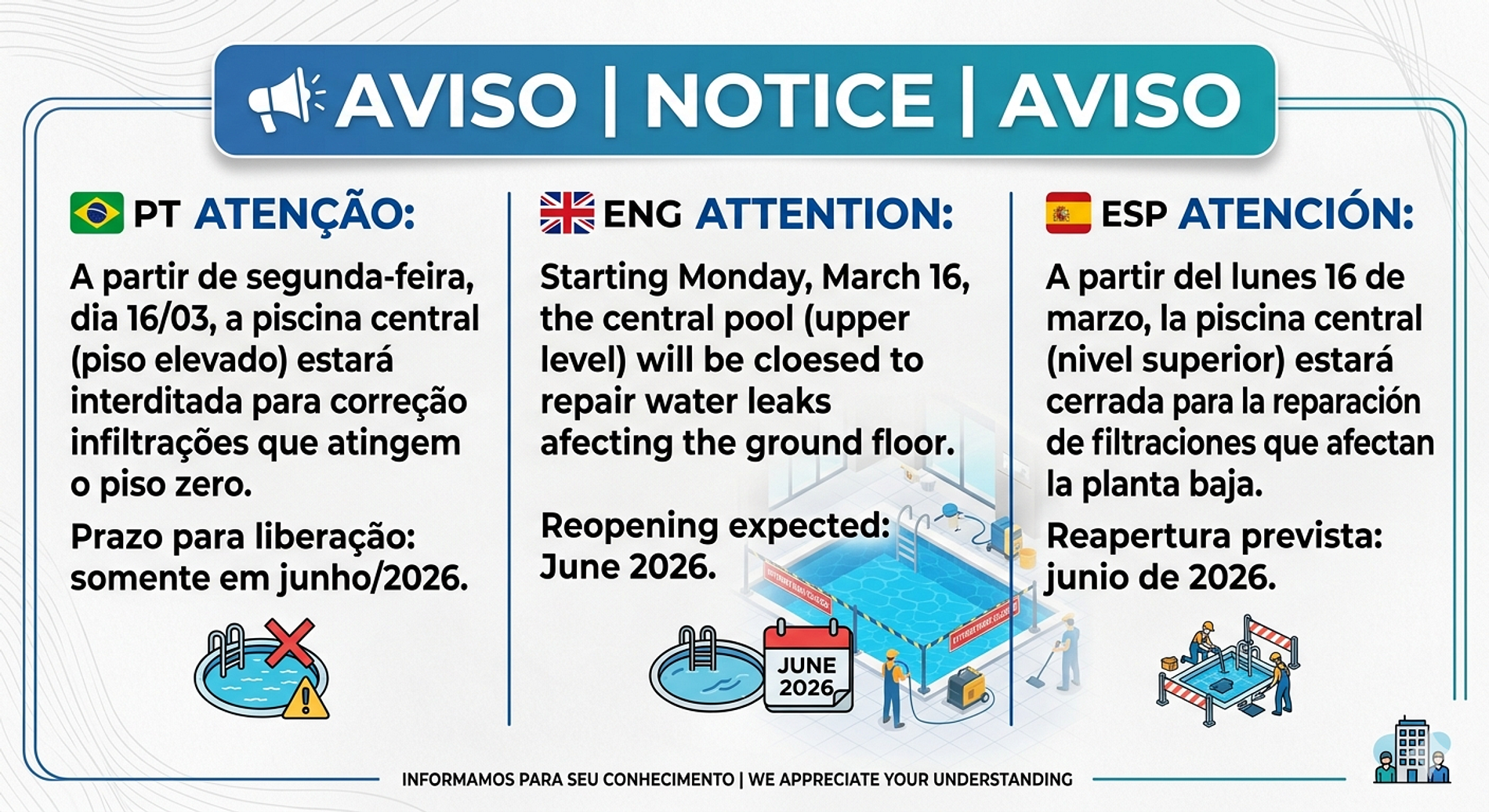 ATENÇÃO: A partir de segunda-feira, dia 16/03, a piscina central (piso elevado) será interditada para correção das infiltrações que atingem o piso zero. Prazo para liberação apenas em junho/26.