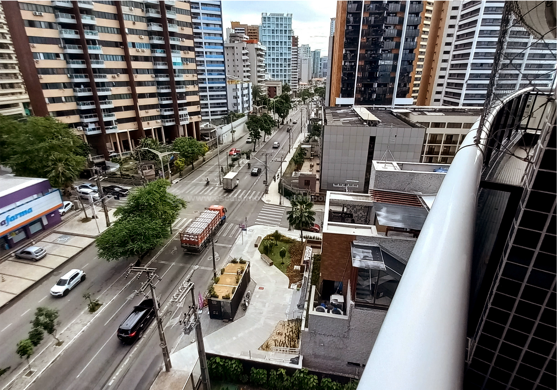 Apto 702 – Diamond Landscape Beira Mar. Suíte com cama de casal e ar, sala com sofá-cama e ar. Vista cidade, andar baixo e 1 vaga. No coração do Meireles, a poucos passos da Beira Mar, com fácil acesso a restaurantes e serviços. Conforto e praticidade na melhor área de Fortaleza.