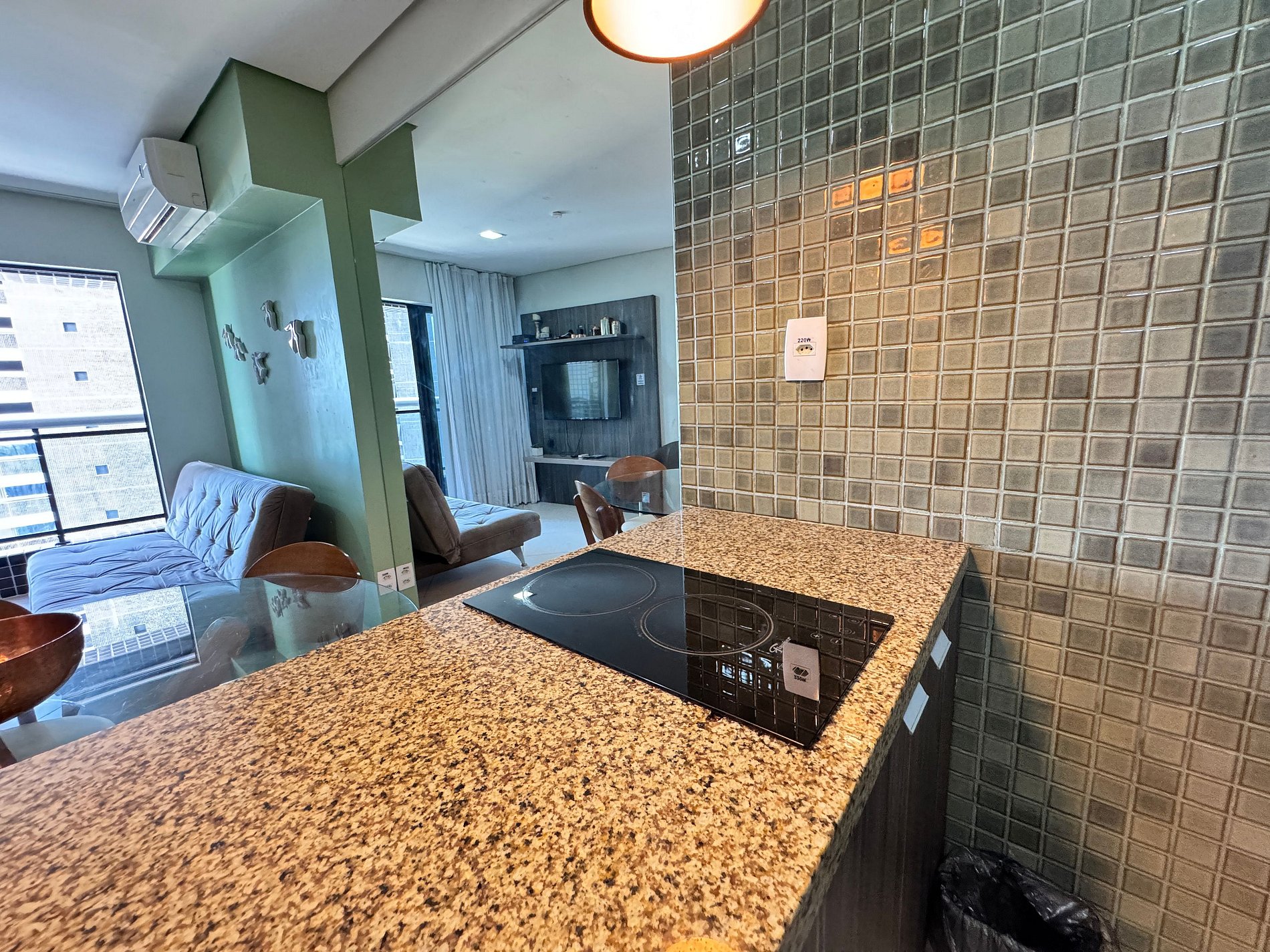 Sala de Estar: Sofá-cama confortável, ar-condicionado e televisão.