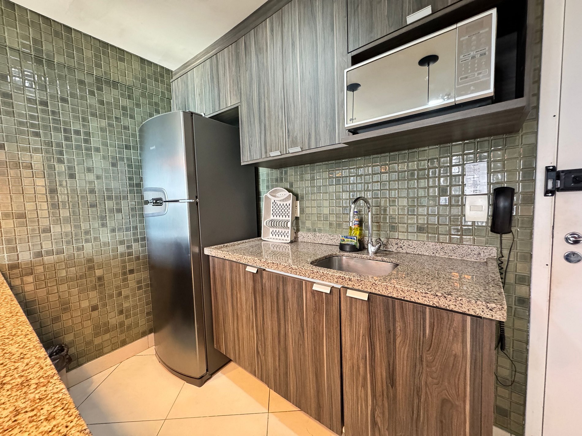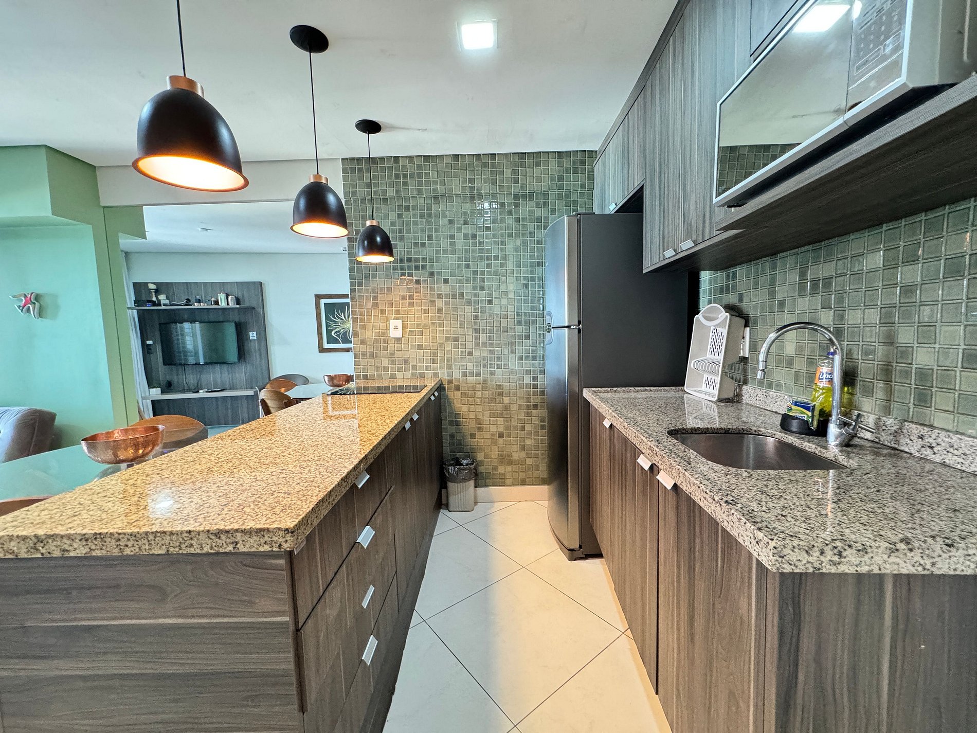 Cozinha Equipada: Estrutura moderna com cooktop, geladeira e micro-ondas.