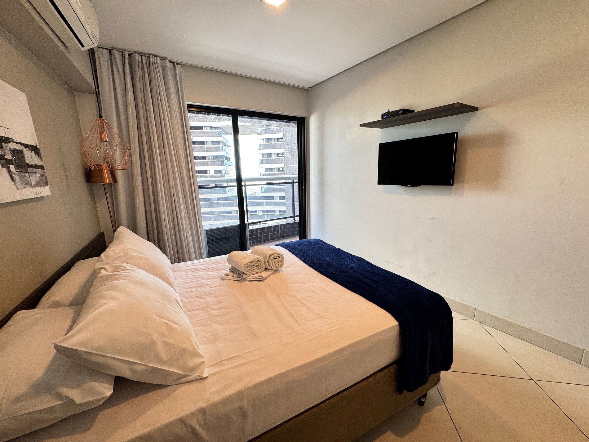 Dormitório: Cama de casal, ar-condicionado, televisão e armários planejados.