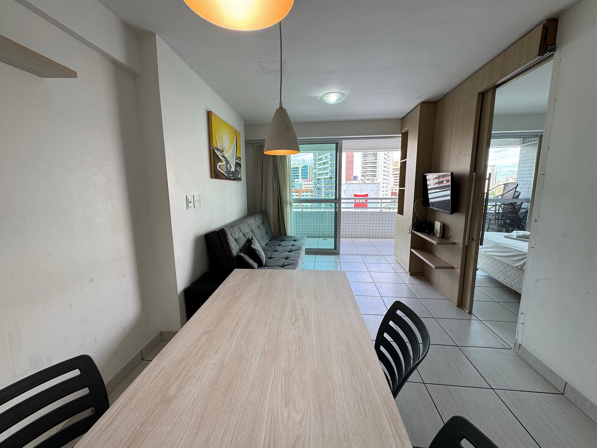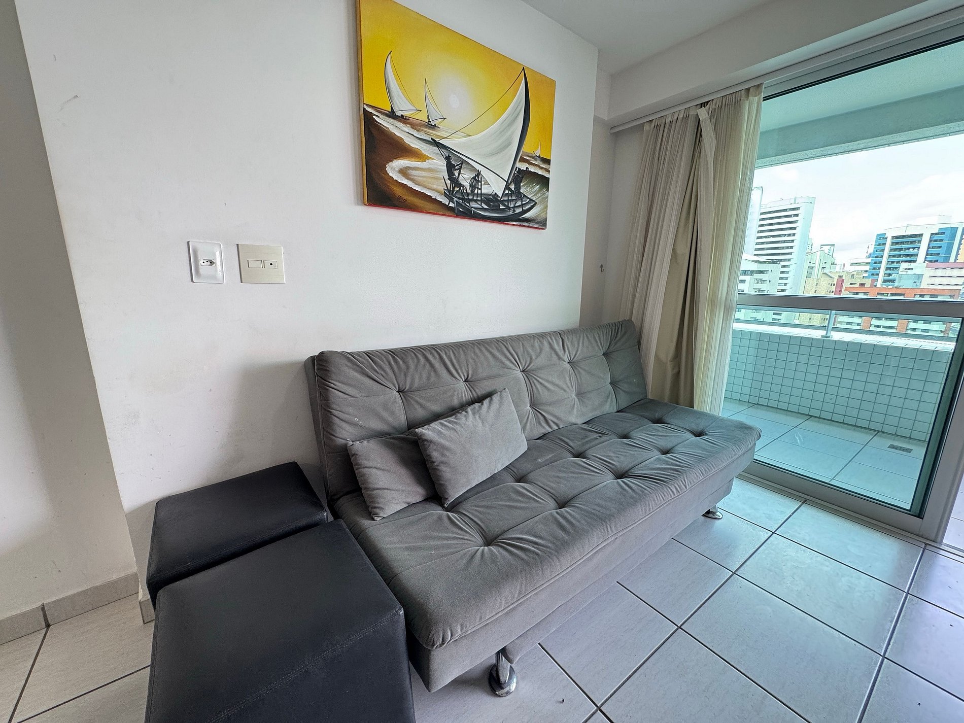 Sala aconchegante com sofá-cama, garantindo espaço extra.