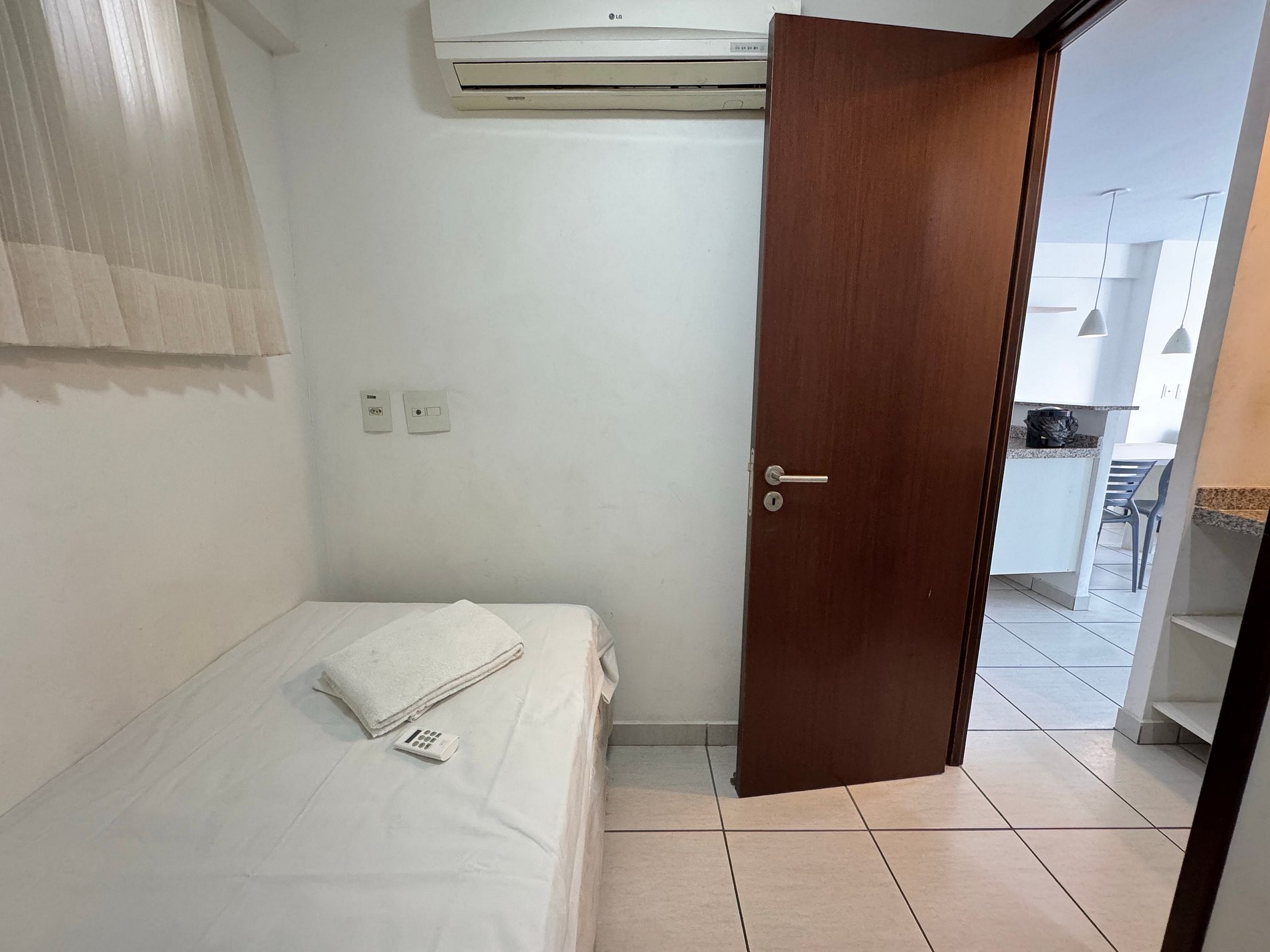1 Quarto com cama de solteiro e ar-condicionado.