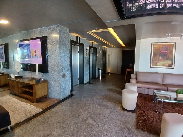 O condomínio dispõe de recepção 24 horas, garantindo segurança e praticidade para os hóspedes, além de piscina ao ar livre com vista para o mar, perfeito para relaxar depois de um dia de passeios. Conta também com restaurante no local, onde é possível desfrutar de refeições sem precisar sair do edifício, além de estacionamento privativo, Wi-Fi gratuito e serviço de limpeza/arrumação.