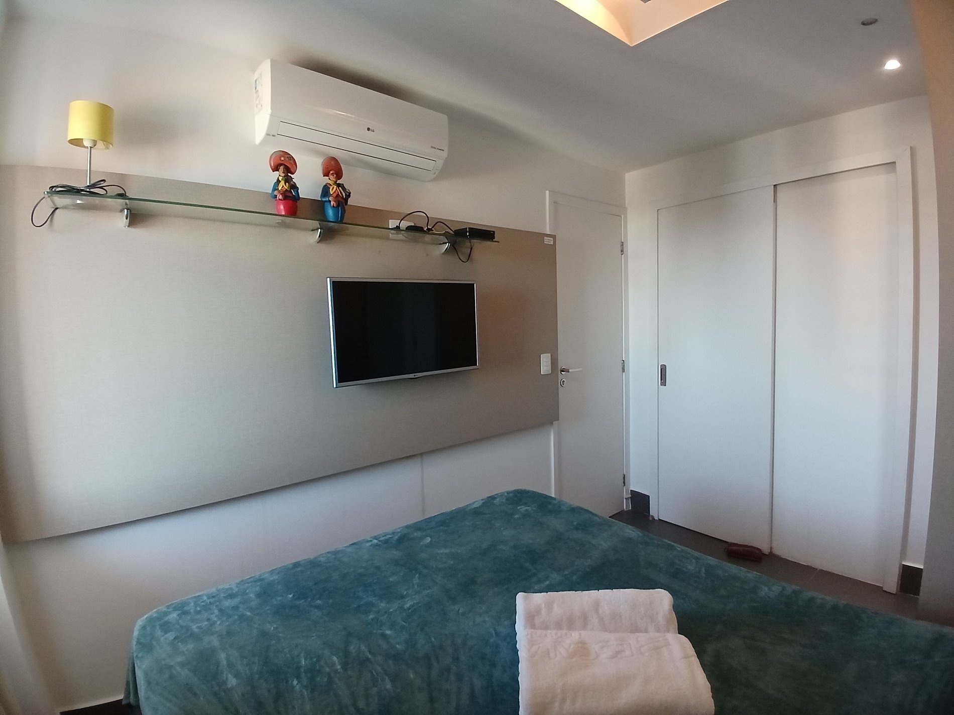 Suíte reversível com cama casal, ar condicionado e tv. Quarto com cama de solteiro e ar condicionado. Banheiro com chuveiro elétrico.