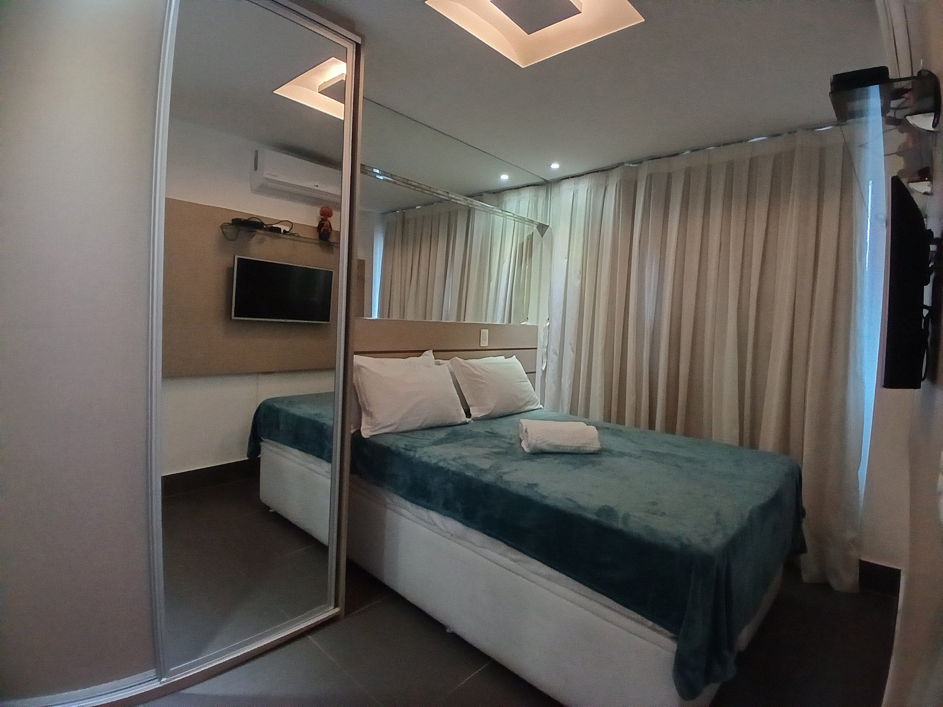 Do apartamento se tem uma vista incrível, da sala, e ambos quartos, a sacada então nem se fala. Na cozinha há forno, micro, torradeira, liquidificador e uma variedade de utensílios, os 2 quartos possuem ar condicionado e variados tipos de iluminaçao a sala também. A porta c senha também é um diferencial pois n precisa se preocupar c perder chave ou catão. A piscina é grande e limpa e possui uma raia p praticar natação. Possui tv na sala e num quarto. O predio possui 3 elevadores q facilitam bastante p n perder tempo na espera. O edificio possui lavanderia propria (paga), e uma pequena academia.