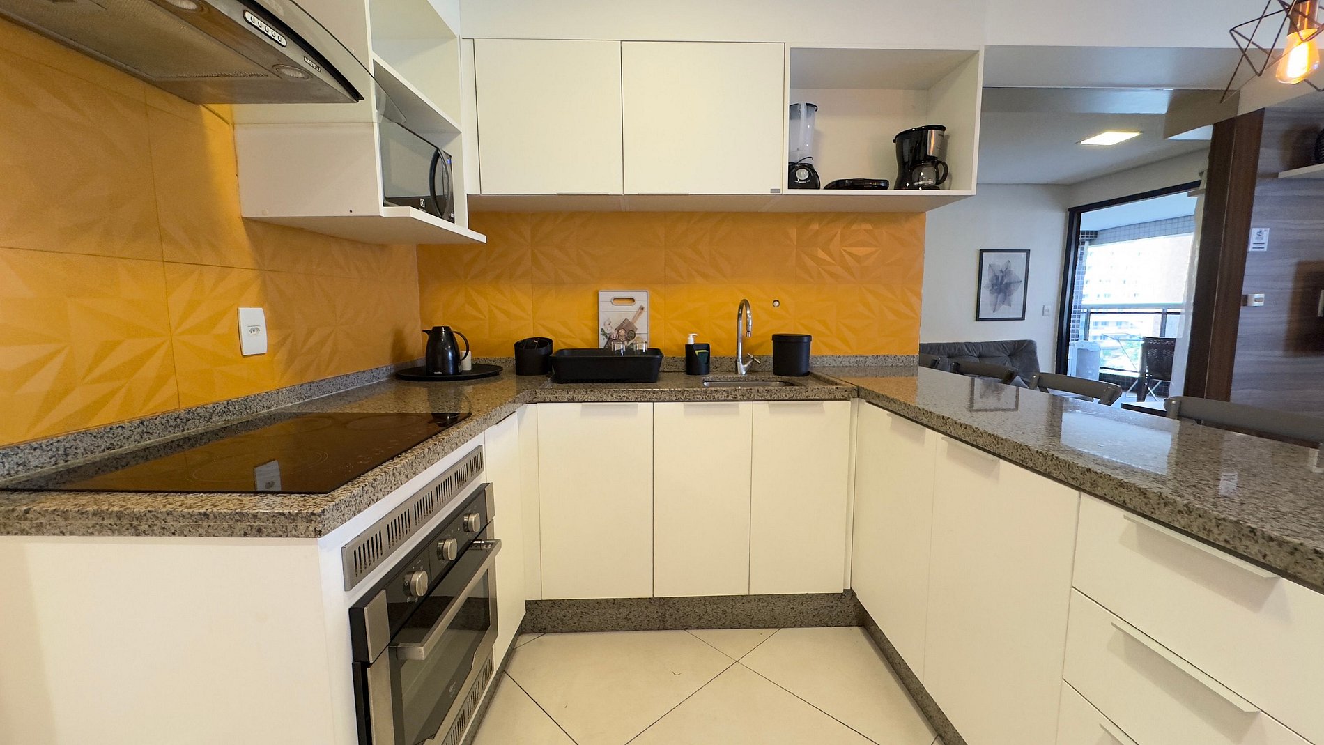- Cozinha totalmente equipada, com fogão cooktop, forno, geladeira, micro-ondas, cafeteira, sanduicheira, liquidificador, panelas, pratos e talheres.